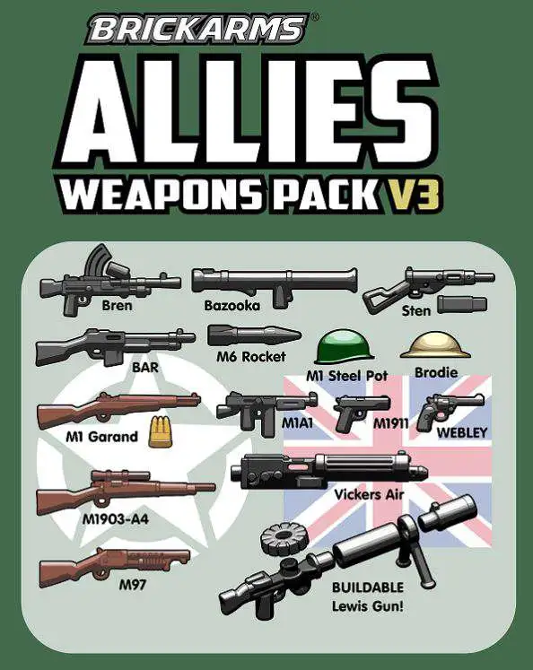 Armies from nations oceans apart join forces to defend freedom with the weaponry and equipment including in the BrickArms Allies Pack V3! With a selection of WWI and WWII American and British rifles, helmets, and heavy weapons, the enemies of freedom dont stand a chance!
