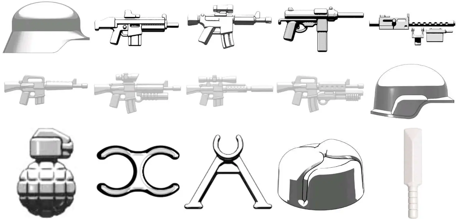 Includes 15 random white brickarms weapons or accessories. May include duplicates.