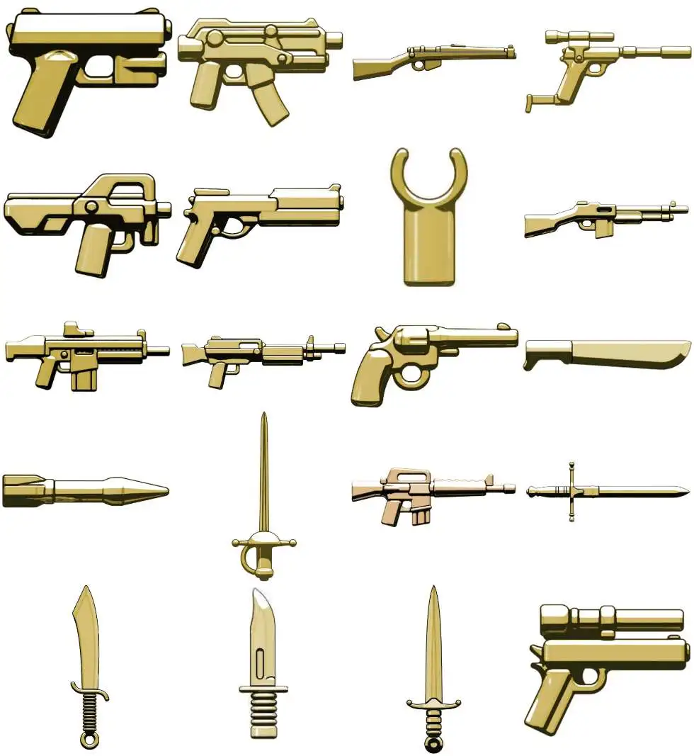 Includes 20 random tan or dark tan brickarms weapons or accessories. May include duplicates.
